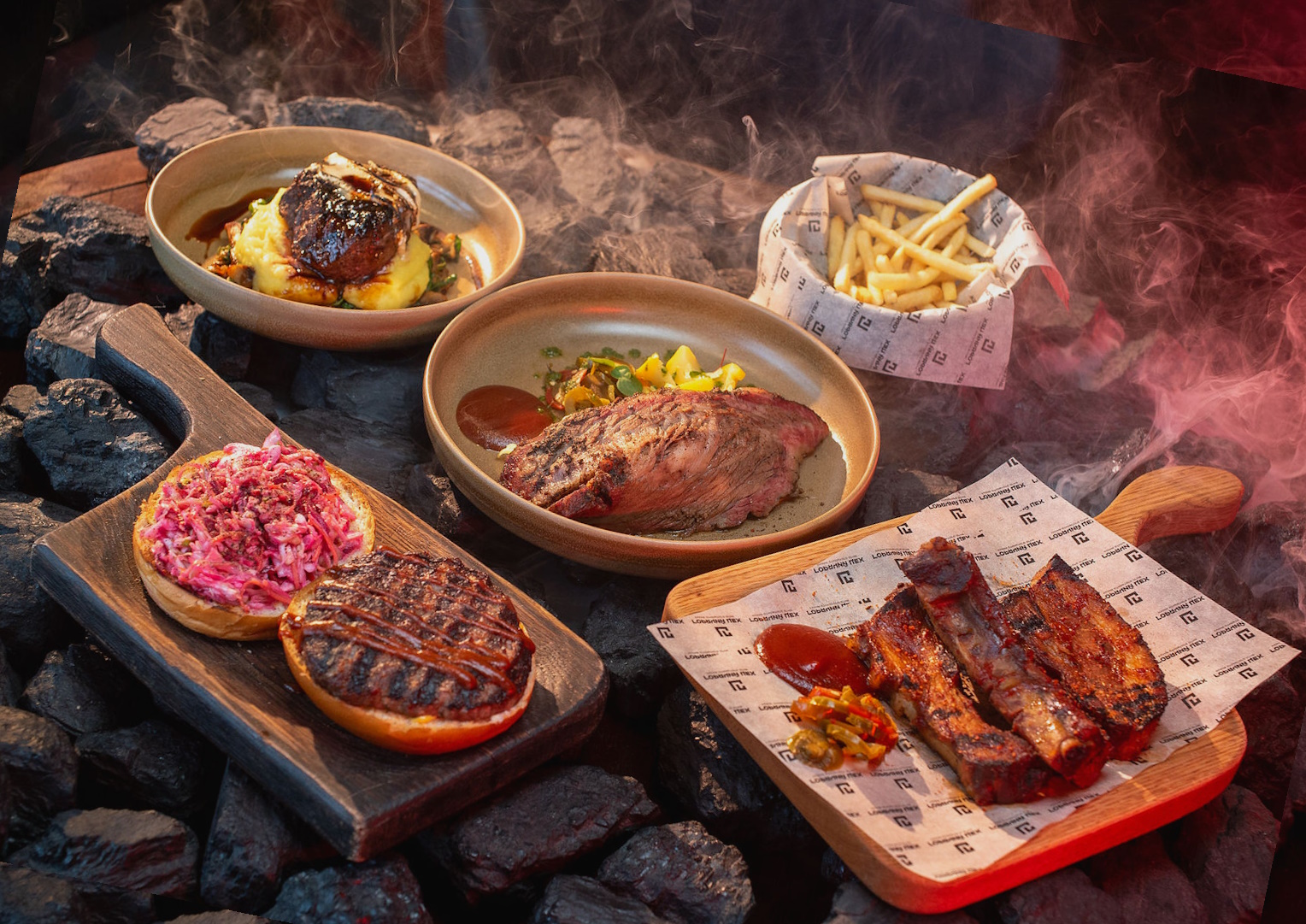 • Мясные деликатесы на гриле и с дымом, включая стейки, ребра и бургеры.
