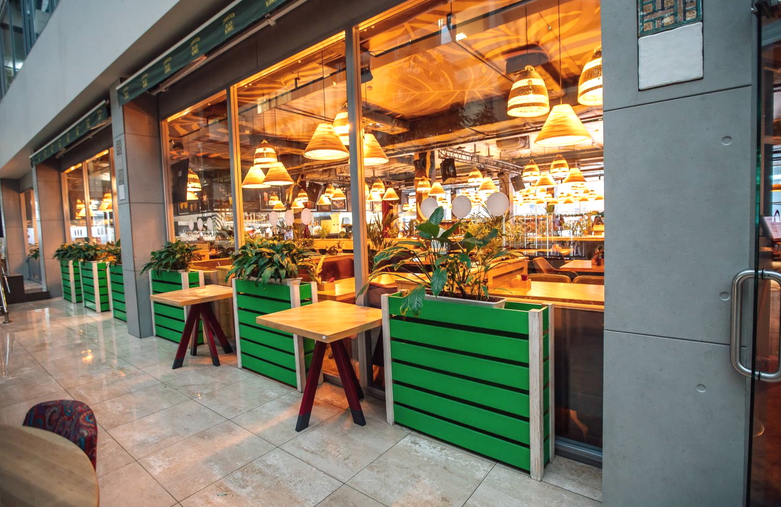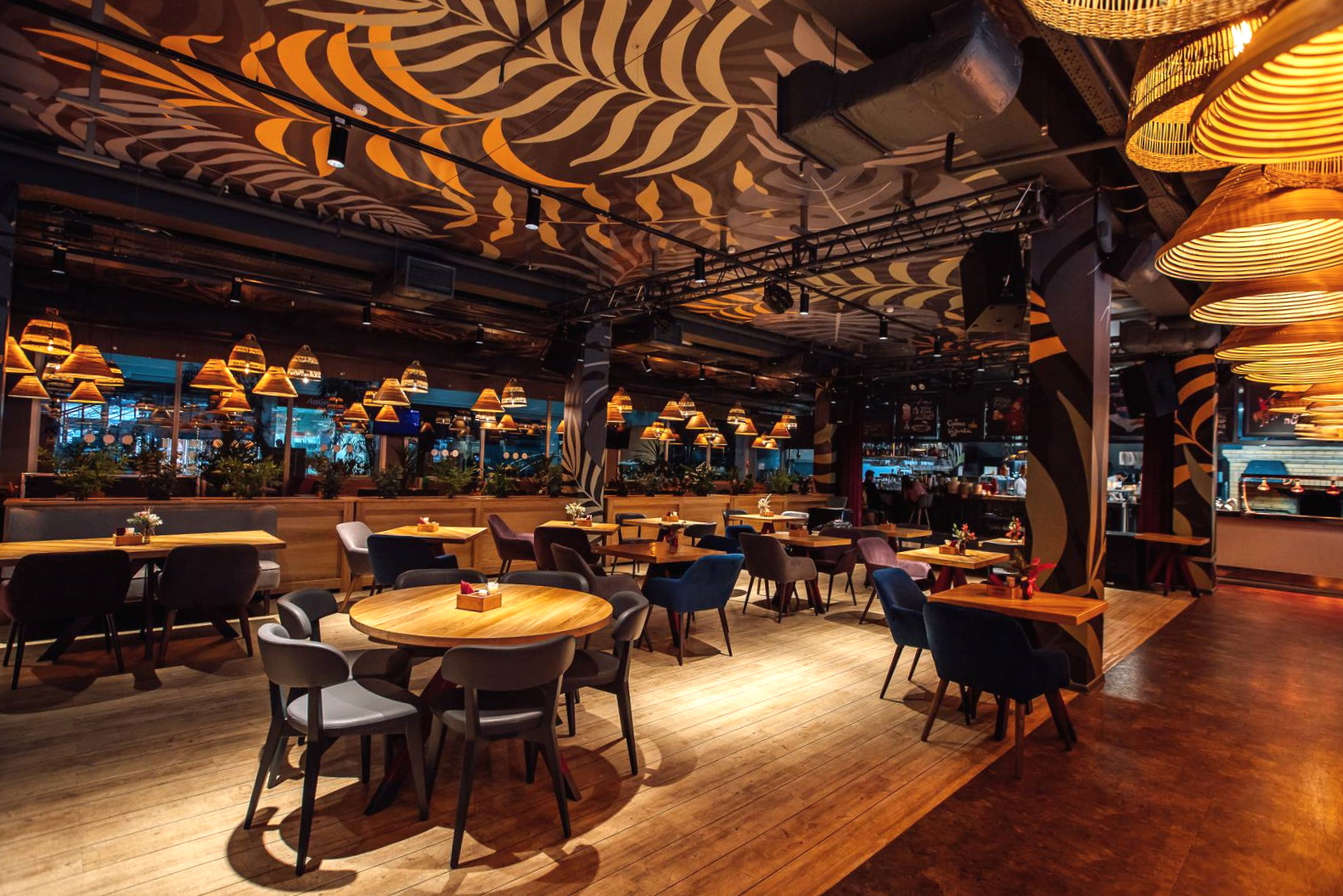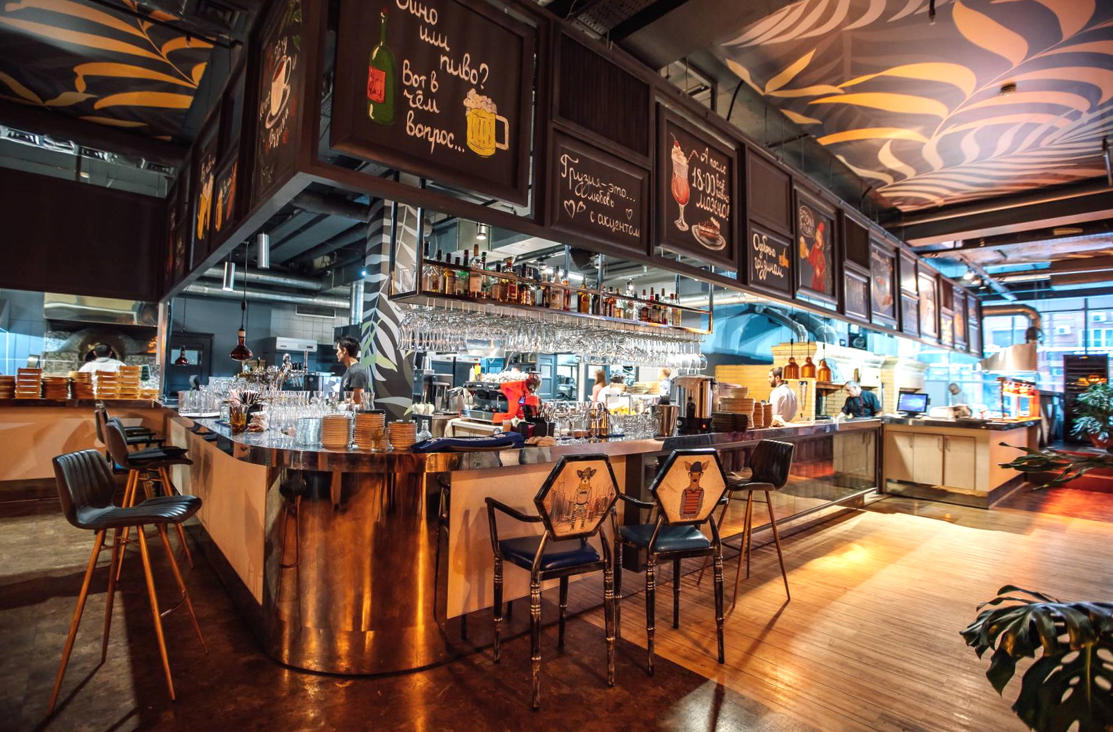 Интерьер выполнен в нейтральных тонах с лёгким барным акцентом: залы зонированы так, что можно сесть как у окна, так и в более тихом углу. В вечерние часы чувствуется оживлённая атмосфера, особенно в прохладную погоду, когда горожане тянутся в тёплые заведения. Ресторан активно работает с доставкой и навынос, что делает его удобным выбором для тех, кто хочет поужинать дома.